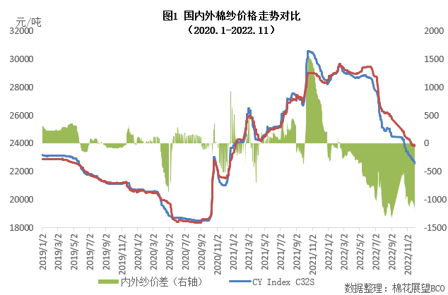 11月,內(nèi)外棉紗價格均繼續(xù)下跌,國產(chǎn)32支純棉紗11月均價22995元/噸,較上月下降1031元,跌幅4.29%,較去年同期下降6916元,跌幅23.1%;進(jìn)口32支純棉紗11月均價24065元/噸,較上月下降658元,跌幅2.66%,較去年同期下跌4811元,跌幅16.7%。