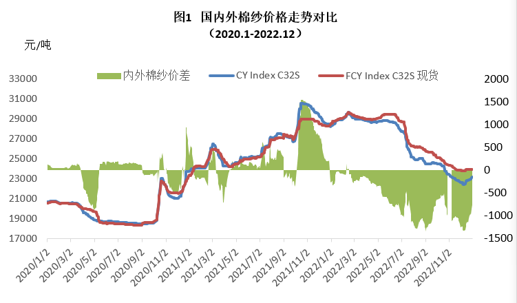 本月中上旬內(nèi)外棉紗價格下跌,中旬開始紗價止跌上漲,但月度均價繼續(xù)下跌。國產(chǎn)32支純棉紗12月均價22753元/噸,較上月下降242元/噸,跌幅1.05%,較去年同期下降5942元/噸,跌幅26.1%;進口32支純棉紗12月均價23887元/噸,較上月下降178元/噸,跌幅0.74%,較去年同期下降4505元,跌幅15.9%。