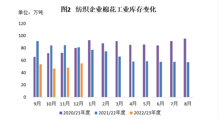 12月,市場預(yù)期需求轉(zhuǎn)暖,悲觀情緒有所緩解,國內(nèi)棉花消費略有好轉(zhuǎn),鄭棉延續(xù)反彈態(tài)勢,紗廠成品出庫加快,原料備貨意愿有所增強,由于月內(nèi)部分工廠工人感染,開工率和產(chǎn)量短期實際增幅受限。據(jù)中國棉花預(yù)警系統(tǒng)對全國90余家定點紡織廠調(diào)查顯示,紡織廠原料庫存略有增加,紡織品產(chǎn)量環(huán)比上升,紗線庫存和布庫存下降。
