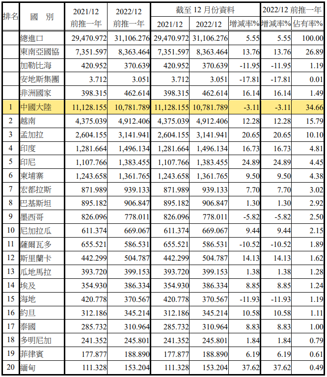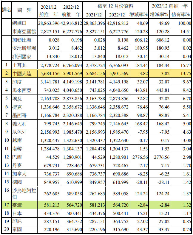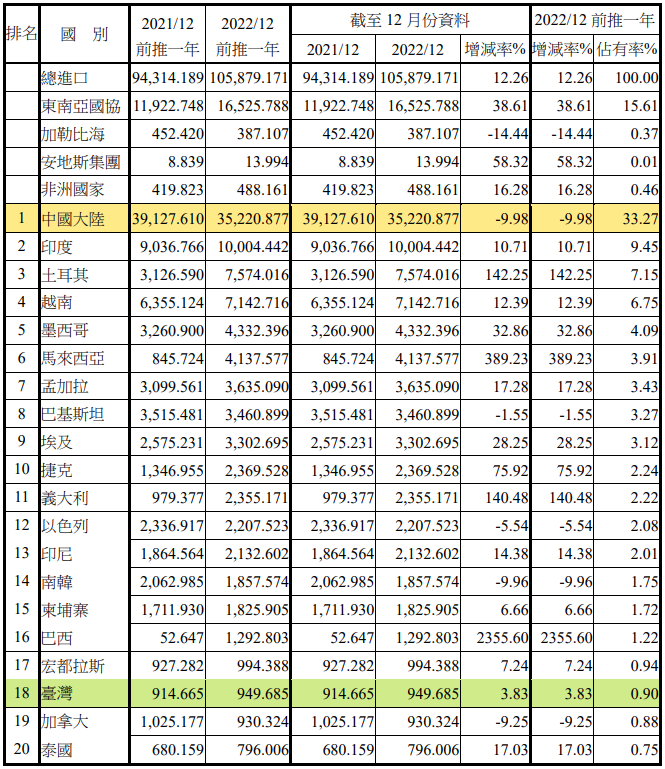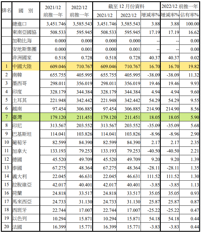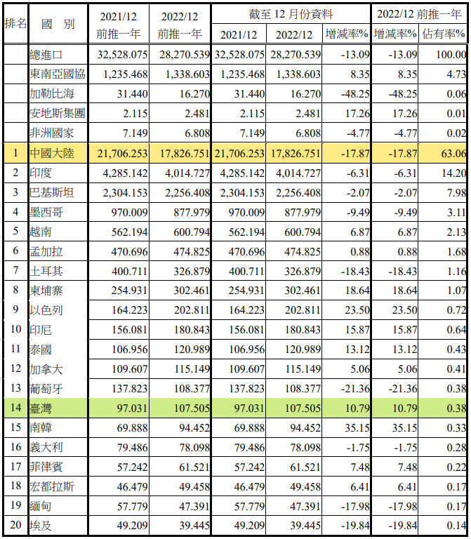 注:依2022年12月前推一年進(jìn)口占有率排序