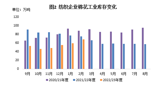本月市場總體預(yù)期向好,紗廠由于原料庫存相對低位,季節(jié)性補(bǔ)庫意愿有所增強(qiáng)。截至2月28日,紡織廠在庫棉花工業(yè)庫存量68.62萬噸,較上月底增加9.3萬噸,同比減少9.01萬噸。其中25%企業(yè)減少棉花庫存,39%增加庫存,36%基本保持不變。