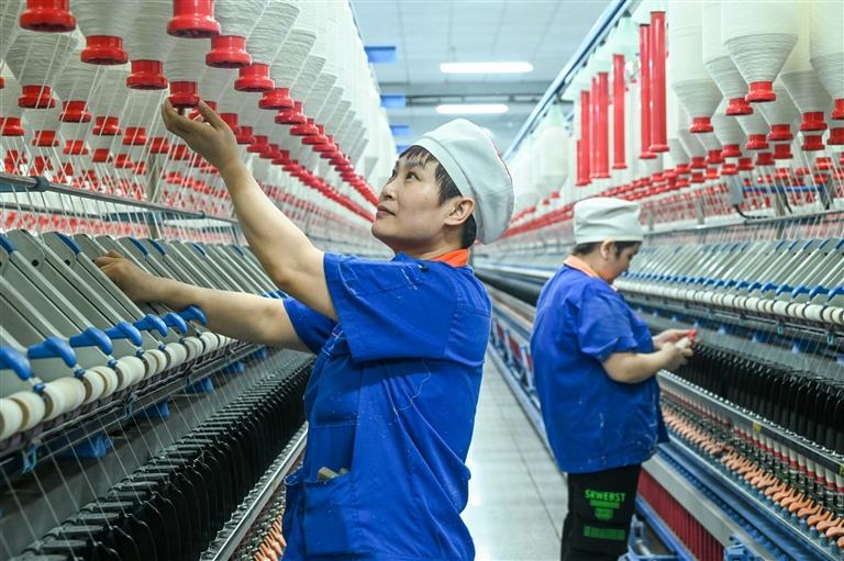 在紡織車間,工人們正在檢查紡紗質(zhì)量。