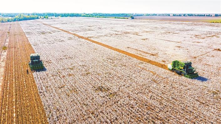 在六師共青團(tuán)農(nóng)場(chǎng)的一塊棉田里,采棉機(jī)在采收新棉(資料圖片)。近年來(lái),兵團(tuán)深化農(nóng)業(yè)供給側(cè)結(jié)構(gòu)性改革,突出優(yōu)質(zhì)優(yōu)價(jià)導(dǎo)向,強(qiáng)化棉花產(chǎn)業(yè)鏈質(zhì)量協(xié)同管理,進(jìn)一步提升了棉花品質(zhì)。