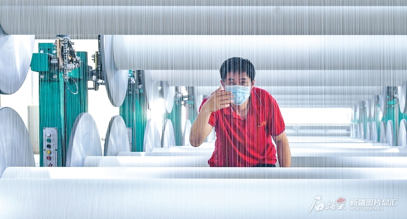 4月25日,在沙雅縣循環(huán)經(jīng)濟(jì)工業(yè)園區(qū)的阿克蘇正倫實業(yè)有限公司生產(chǎn)車間,工人正在察看生產(chǎn)的紗線。該公司是沙雅縣重點招商引資項目,自2020年投產(chǎn)以來先后帶動本地群眾500余人就業(yè),2022年銷售收入突破4億元。