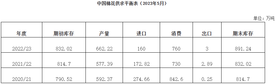 4月,我國經(jīng)濟(jì)運行延續(xù)恢復(fù)向好態(tài)勢,消費恢復(fù)較快,有關(guān)部門公布2023-2025年棉花目標(biāo)價格政策,新年度植棉預(yù)測面積有所下降,受以上因素推動,國內(nèi)棉價上漲;國際棉價受美聯(lián)儲加息等因素影響下跌,月末國內(nèi)價格反超國際。當(dāng)月國內(nèi)棉花供應(yīng)充足,紡織廠開機(jī)率維持高位,但新增訂單不足,原料采購并不積極,仍以剛需為主。中國棉花協(xié)會預(yù)計,2022年度全國棉花產(chǎn)量662.2萬噸,同比增長14.7%;進(jìn)口量160萬噸,同比下降7.4%;棉花消費量、出口量分別760萬噸、3萬噸;期末庫存891.2萬噸,同比增長7.1%。