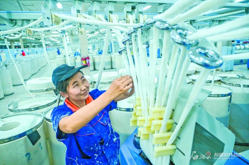 7月8日,新疆宇華紡織科技有限公司員工在生產(chǎn)車間作業(yè)。該公司位于呼圖壁縣五工臺(tái)鎮(zhèn),是自治區(qū)級(jí)農(nóng)業(yè)產(chǎn)業(yè)化龍頭企業(yè),目前日產(chǎn)棉紗近100噸,產(chǎn)品暢銷長三角、珠三角等地。