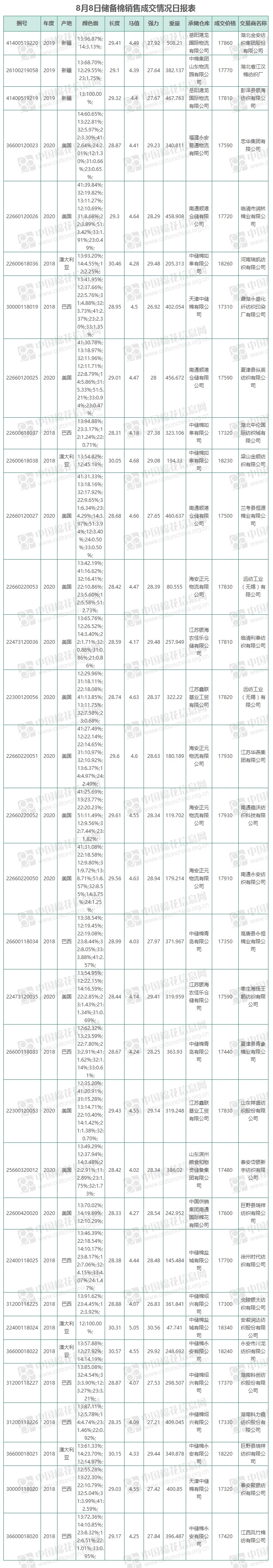 8月8日儲(chǔ)備棉銷售資源10002.3715噸,實(shí)際成交10002.3715噸,成交率100%,成交均價(jià)17647元/噸,較前一日下跌143元/噸,折3128價(jià)格18155元/噸,較前一日下跌63元/噸。