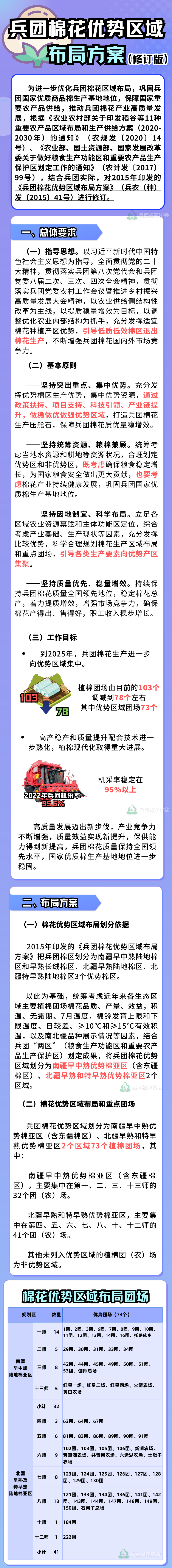 根據(jù)《農(nóng)業(yè)農(nóng)村部關(guān)于印發(fā)稻谷等11種重要農(nóng)產(chǎn)品區(qū)域布局和生產(chǎn)供給方案(2020-2030年)的通知》,結(jié)合兵團(tuán)實(shí)際,兵團(tuán)農(nóng)業(yè)農(nóng)村局對(duì)2015年印發(fā)的《兵團(tuán)棉花優(yōu)勢(shì)區(qū)域布局方案》(以下簡(jiǎn)稱《方案》)進(jìn)行修訂,以農(nóng)業(yè)供給側(cè)結(jié)構(gòu)性改革為主線,以提質(zhì)穩(wěn)量增效為目標(biāo),充分發(fā)揮適宜棉花種植產(chǎn)區(qū)優(yōu)勢(shì),引導(dǎo)低質(zhì)低效棉區(qū)退出棉花生產(chǎn),不斷增強(qiáng)兵團(tuán)棉花國內(nèi)外市場(chǎng)競(jìng)爭(zhēng)力。