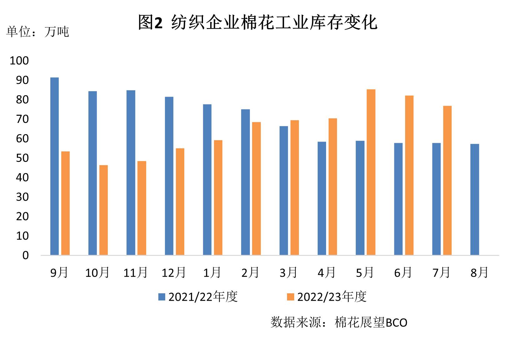 1.紡織廠使用新疆棉占總用棉量的85.12%,較上月減少0.85個(gè)百分點(diǎn),同比減少2.65個(gè)百分點(diǎn),其中儲(chǔ)備新疆棉占比為3.2%,2022/23年度新疆棉占比為82.6%。