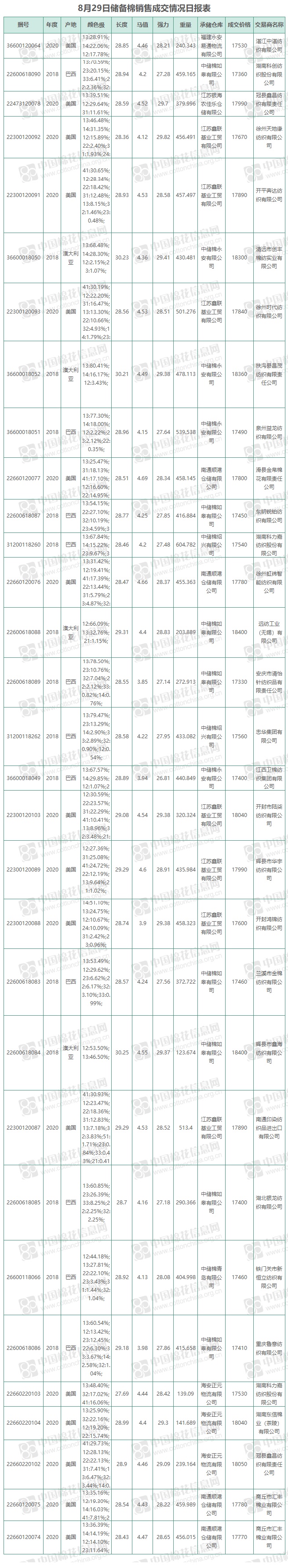 8月29日儲(chǔ)備棉銷(xiāo)售資源12000.203噸,實(shí)際成交12000.203噸,成交率100%,成交均價(jià)17734元/噸,較前一日下跌175元/噸,折3128價(jià)格18318元/噸,較前一日下跌40元/噸。