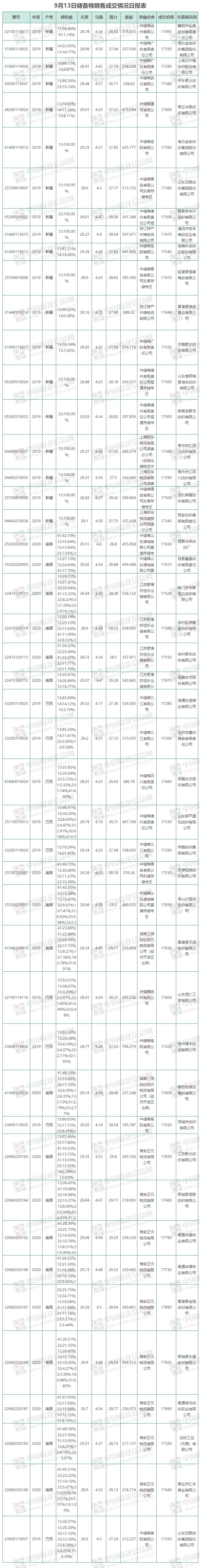 9月13日儲備棉銷售資源20001.0817噸,實際成交15978.6577噸,成交率79.89%,成交均價17505元/噸,較前一日上漲13元/噸,折3128價格17949元/噸,較前一日下跌67元/噸。