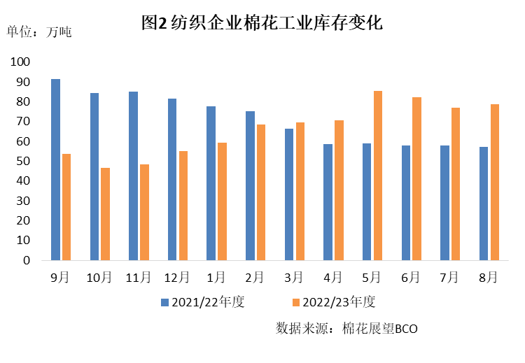 8月,紡織廠原料采購(gòu)來(lái)源豐富,紡織廠積極競(jìng)拍儲(chǔ)備棉,成交率100%,現(xiàn)貨市場(chǎng)上企業(yè)也逢低進(jìn)貨,同時(shí)部分增加進(jìn)口棉采購(gòu),月內(nèi)紡企原料庫(kù)存總體有所增加。截至8月31日,紡織廠在庫(kù)棉花工業(yè)庫(kù)存量78.84萬(wàn)噸,環(huán)比增加1.99萬(wàn)噸,同比增加21.52萬(wàn)噸。其中27%企業(yè)減少棉花庫(kù)存,38%增加庫(kù)存,45%基本保持不變。