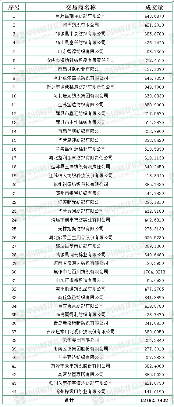 新疆棉成交均價(jià)17545元/噸,較前一日上漲149元/噸,新疆棉折3128價(jià)格17988元/噸,較前一日上漲133元/噸,新疆棉平均加價(jià)幅度486元/噸。