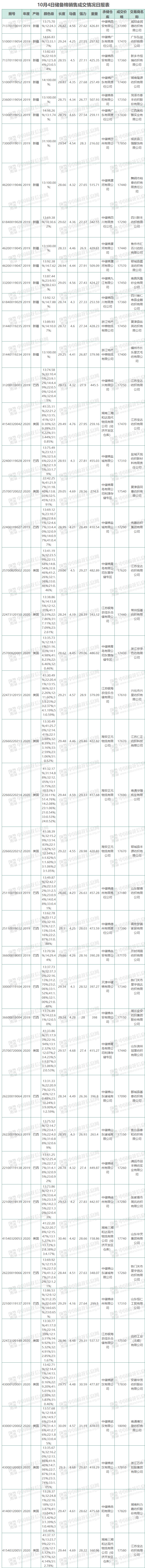 10月4日儲備棉銷售資源20001.0514噸,實際成交17870.0758噸,成交率89.35%,成交均價17458元/噸,較前一日持平,折3128價格17968元/噸,較前一日上漲68元/噸。