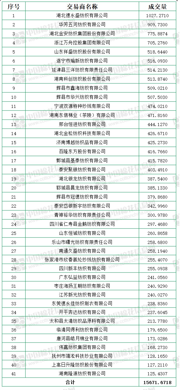 10月11日儲備棉銷售資源20001.8538噸,實際成交15671.6718噸,成交率78.35%,成交均價17269元/噸,較前一日下跌169元/噸,折3128價格17807元/噸,較前一日下跌68元/噸。