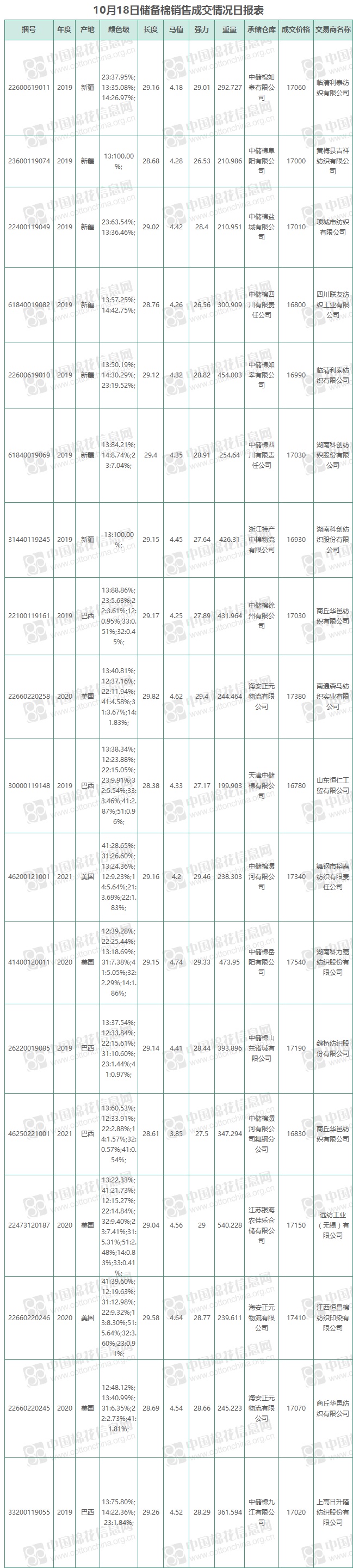 10月18日儲備棉銷售資源20001.1087噸,實際成交5866.9562噸,成交率29.33%,成交均價17094元/噸,較前一日上漲19元/噸,折3128價格17568元/噸,較前一日下跌45元/噸。