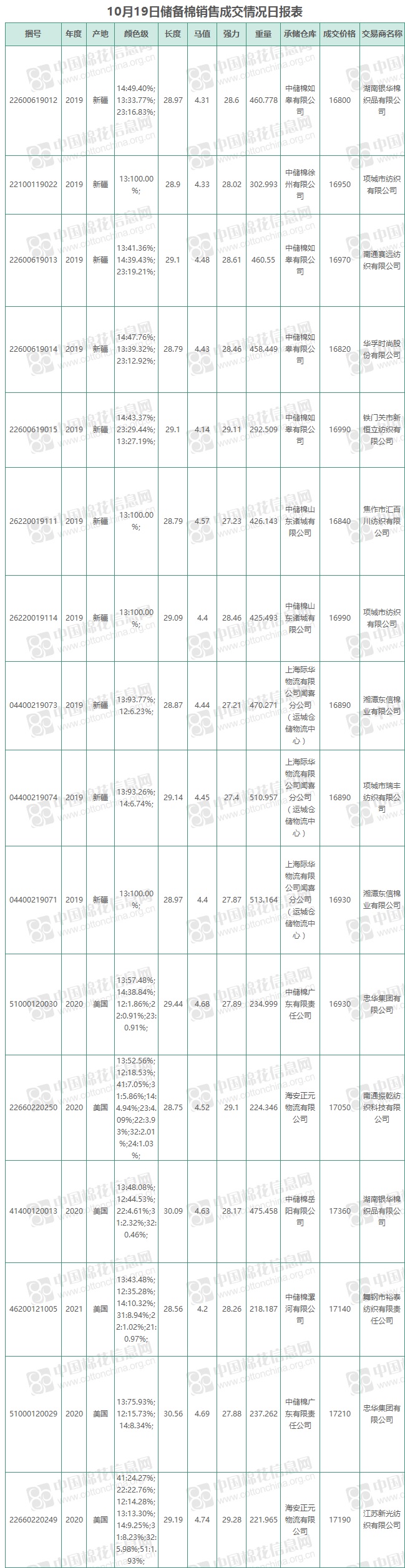 10月19日儲(chǔ)備棉銷售資源20000.6759噸,實(shí)際成交5933.5246噸,成交率29.67%,成交均價(jià)16977元/噸,較前一日下跌117元/噸,折3128價(jià)格17535元/噸,較前一日下跌33元/噸。