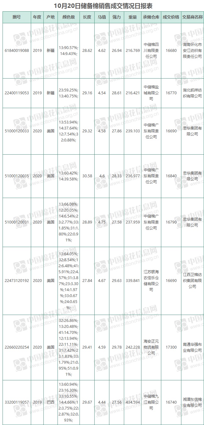 10月20日儲備棉銷售資源20001.4988噸,實際成交2163.8916噸,成交率10.82%,成交均價16803元/噸,較前一日下跌174元/噸,折3128價格17459元/噸,較前一日下跌76元/噸。