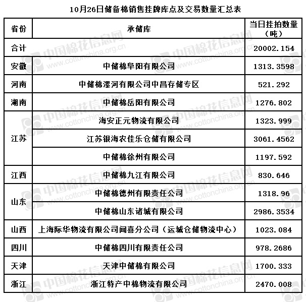 中國儲(chǔ)備棉管理有限公司定于10月26日通過全國棉花交易市場上市銷售儲(chǔ)備棉重量20002.154噸,共52捆。具體庫點(diǎn)及數(shù)量見下表。