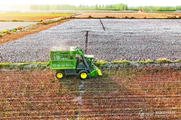 10月23日,大型采棉機(jī)在新和縣玉奇喀特鎮(zhèn)先鋒村的棉田里收獲新棉(無人機(jī)攝)。眼下,新和縣種植的83萬畝棉花迎來采收季,棉農(nóng)加緊采收,確保朵絮歸倉。
