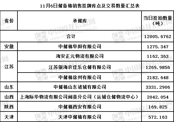 中國儲備棉管理有限公司定于11月6日通過全國棉花交易市場上市銷售儲備棉重量12005.6762噸,共34捆。具體庫點及數(shù)量見下表。