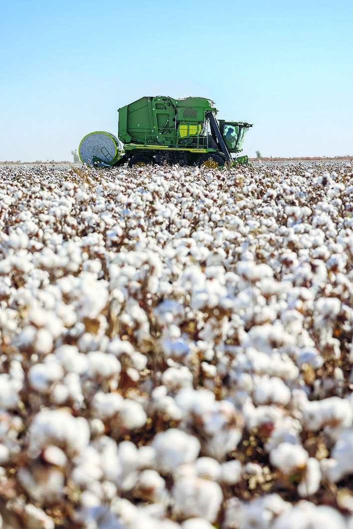 11月4日,在庫(kù)車景潤(rùn)農(nóng)作物種植農(nóng)民專業(yè)合作社的棉花種植基地,社員正駕駛采棉機(jī)采收棉花。當(dāng)前,地區(qū)各地棉花進(jìn)入采收季,棉農(nóng)加緊采收新棉。