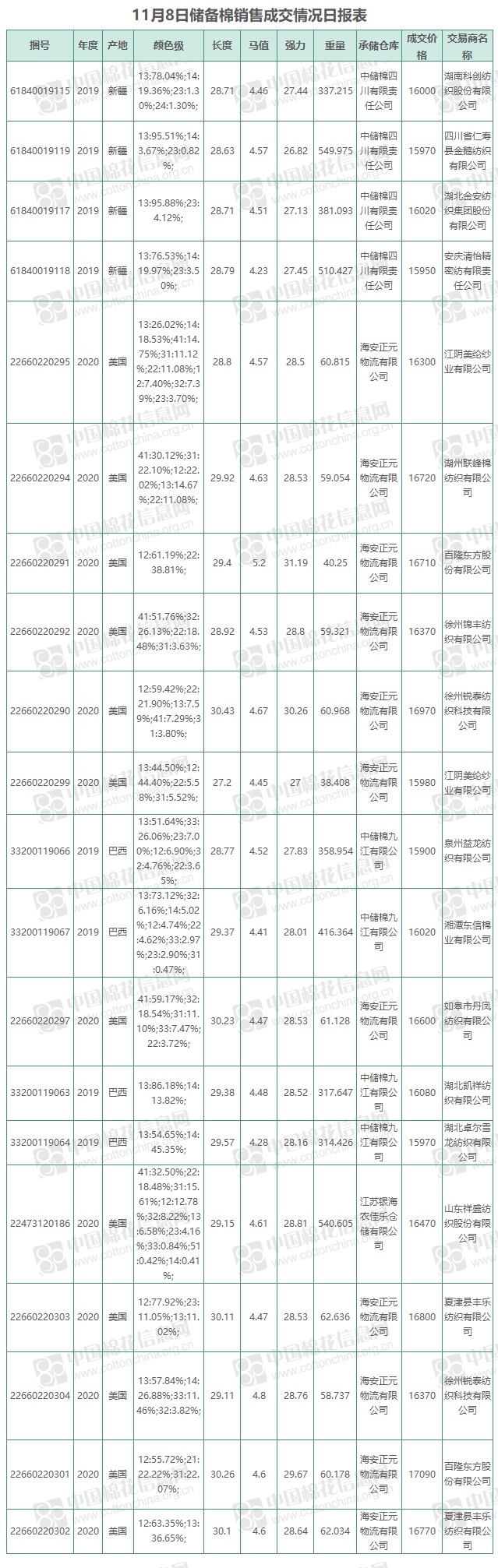 11月8日儲(chǔ)備棉銷售資源12003.2403噸,實(shí)際成交4350.2351噸,成交率36.24%,成交均價(jià)16138元/噸,較前一日下跌53元/噸,折3128價(jià)格16729元/噸,較前一日上漲66元/噸。