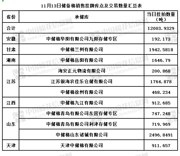 中國(guó)儲(chǔ)備棉管理有限公司定于11月13日通過(guò)全國(guó)棉花交易市場(chǎng)上市銷(xiāo)售儲(chǔ)備棉重量12003.9329噸,共51捆。具體庫(kù)點(diǎn)及數(shù)量見(jiàn)下表。