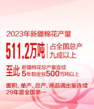 12月25日國家統(tǒng)計局公布的全國棉花產(chǎn)量數(shù)據(jù)顯示,2023年新疆棉花產(chǎn)量511.2萬噸,占全國總產(chǎn)9成以上。至此新疆棉花總產(chǎn)量連續(xù)5年穩(wěn)定在500萬噸以上,面積、單產(chǎn)、總產(chǎn)、商品調(diào)出量連續(xù)29年居全國第1。