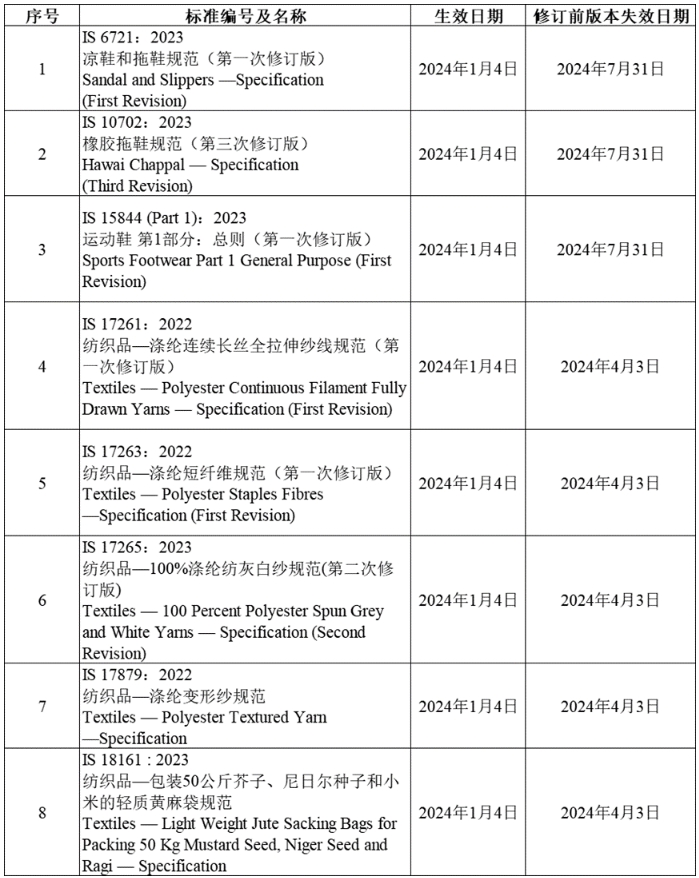 2024年1月10日,印度標準局修訂并發(fā)布8項鞋類和紡織品類產(chǎn)品標準,此前執(zhí)行的標準版本將于2024年4月3日起逐步撤銷,具體修訂情況如下。