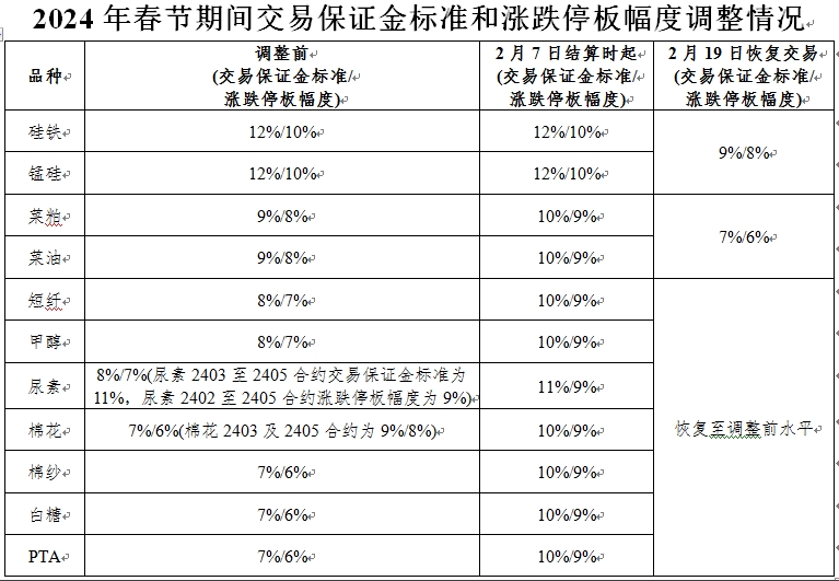 根據(jù)《鄭州商品交易所期貨交易風險控制管理辦法》第八條規(guī)定,經研究決定,對2024年春節(jié)期間部分期貨合約交易保證金標準和漲跌停板幅度作出如下調整: