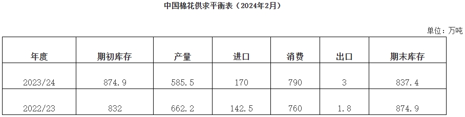 1月,國內多項經濟數(shù)據(jù)良好,有關部門持續(xù)發(fā)布穩(wěn)定市場政策,紡織市場運行向好,開工率維持高位,企業(yè)訂單較充足,節(jié)前積極采購原料,帶動國內棉價逐步走高,漲幅高于國際,內外棉價差擴大。臨近春節(jié),新棉交售基本結束,全國加工量持續(xù)增加,但增幅有所放緩,商業(yè)庫存僅小幅增加。中國棉花協(xié)會預計,2023/24年度我國棉花產量585.5萬噸,同比下降11.6%;消費量790萬噸,同比增長4%;進口量170萬噸,同比增長19%;出口3萬噸,期末庫存為835萬噸,同比下降4.3%。