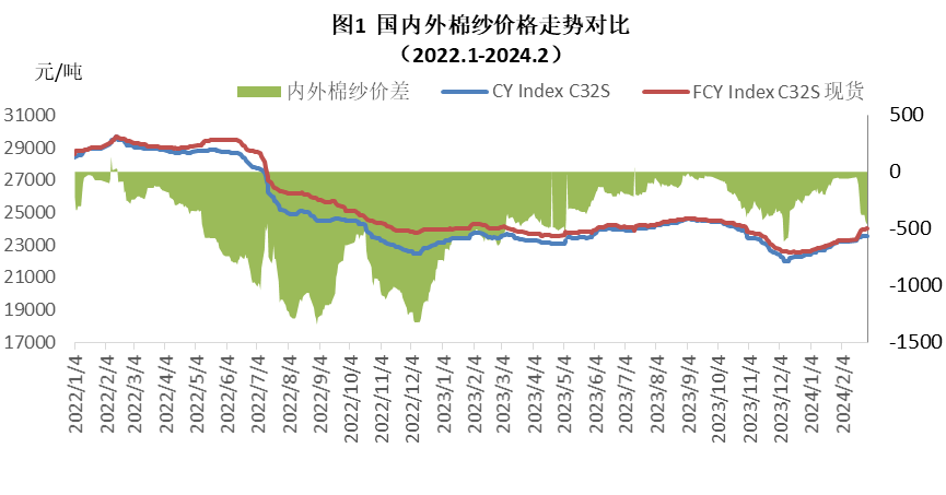 2月,內(nèi)外棉紗價格上漲,國產(chǎn)32支純棉紗月均價22765元/噸,環(huán)比上漲538元,漲幅2.4%,同比下跌586元,跌幅2.5%;進(jìn)口32支純棉紗月均價22910元/噸,環(huán)比上漲321元,漲幅1.4%,同比下跌1077元,跌幅4.5%。