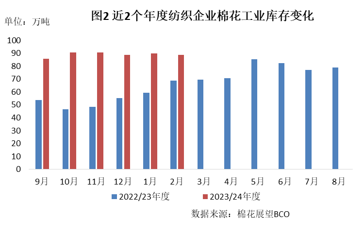 春節(jié)前,紡織廠剛需補(bǔ)庫,節(jié)后皮棉報價上漲,棉企銷售積極性增強(qiáng),紡織廠觀望心態(tài)較濃,原料庫存有所下降。截至2月29日,紡織廠在庫棉花工業(yè)庫存量88.9萬噸,環(huán)比減少0.8萬噸,同比增加20.3萬噸。其中36%企業(yè)減少棉花庫存,31%增加庫存,34%基本保持不變。