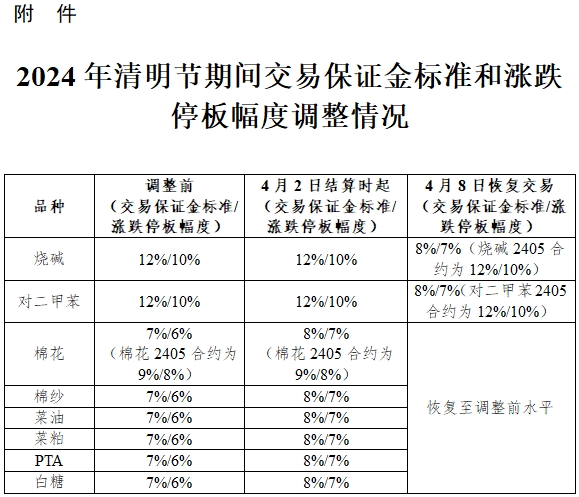 根據(jù)《鄭州商品交易所期貨交易風(fēng)險控制管理辦法》第八條規(guī)定,經(jīng)研究決定,對2024年清明節(jié)期間部分期貨合約交易保證金標(biāo)準(zhǔn)和漲跌停板幅度作出如下調(diào)整: