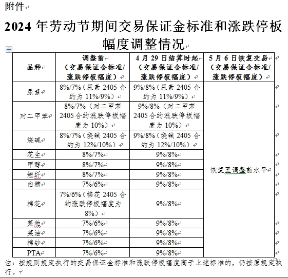 根據(jù)《鄭州商品交易所期貨交易風(fēng)險控制管理辦法》第八條規(guī)定,經(jīng)研究決定,對2024年勞動節(jié)期間部分期貨合約的交易保證金標(biāo)準(zhǔn)和漲跌停板幅度作出如下調(diào)整: