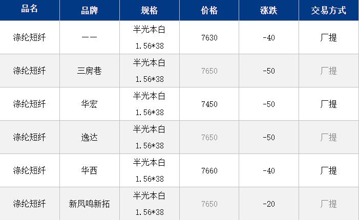 江蘇滌綸短纖現(xiàn)貨價(jià)格下跌40元在7630元/噸。外圍偏弱拖累市場(chǎng),上午PX-PTA-PF期貨震蕩下行,短纖在近期減產(chǎn)增加下現(xiàn)貨略微抗跌;目前工廠價(jià)格7700元/噸附近自提,貿(mào)易商一口價(jià)7600-7650元/噸自提;基差方面,主流品牌10+150到200,偏低10平水附近。