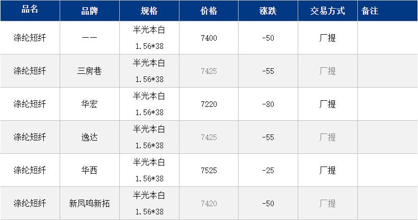 1.4D半光直紡滌綸短纖江浙商談重心7150-7600元/噸出廠或短送,福建7400-7550元/噸附近短送,山東、河北主流7300-7650元/噸送到。
