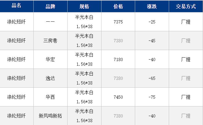 1.4D半光直紡滌綸短纖江浙商談重心7150-7500元/噸出廠或短送,福建7400-7500元/噸附近短送,山東、河北主流7300-7600元/噸送到。