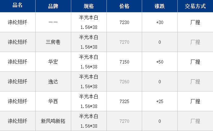 江蘇滌綸短纖現(xiàn)貨價(jià)格上漲30元在7230元/噸;目前工廠價(jià)格7350元/噸附近自提,貿(mào)易商一口價(jià)7220-7300元/噸自提,偏低7150元/噸附近。