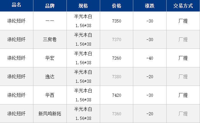 1.4D半光直紡滌綸短纖江浙商談重心7300-7550元/噸出廠或短送,福建7550-7650元/噸附近短送,山東、河北主流7450-7600元/噸送到。