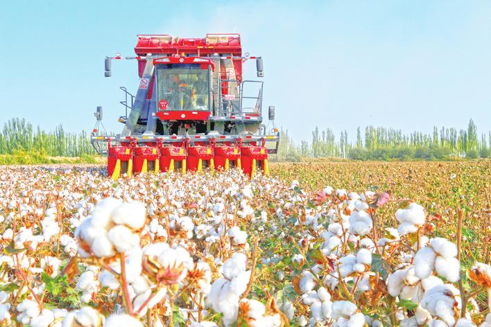 近日,在阿瓦提縣塔木托格拉克鎮(zhèn)一棉田里,采棉機(jī)在采收棉花。眼下,阿瓦提縣棉花陸續(xù)進(jìn)入采收期,棉農(nóng)搶抓晴好天氣采收棉花,確保朵絮歸倉。