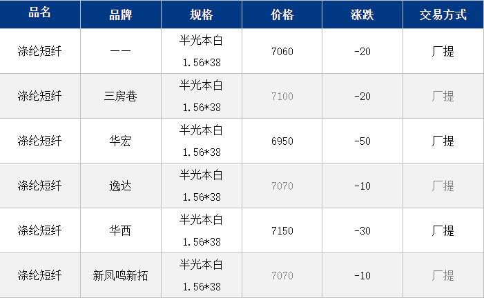 1.4D半光直紡滌綸短纖江浙商談重心6950-7250元/噸出廠或短送,福建7200-7350元/噸附近短送,山東、河北主流7100-7350元/噸送到。