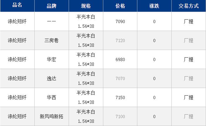 1.4D半光直紡滌綸短纖江浙商談重心7000-7250元/噸出廠或短送,福建7200-7350元/噸附近短送,山東、河北主流7100-7350元/噸送到。