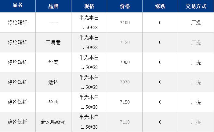 1.4D半光直紡滌綸短纖江浙主流成交商談7150-7250元/噸出廠或短送,福建主流成交商談7300-7350元/噸現(xiàn)款短送,外省貨源7200-7300元/噸送到,山東、河北主流7100-7350元/噸送到。