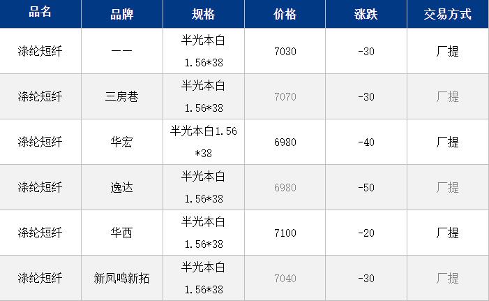 江蘇滌綸短纖現(xiàn)貨價格下跌30元到7030元/噸;成本疲弱,短纖價格窄幅下跌;早間工廠報價多下調50-100元/噸,現(xiàn)貨看,工廠價格7100-7150元/噸自提,貿易商一口價7000-7050元/噸自提,偏低6950元/噸。