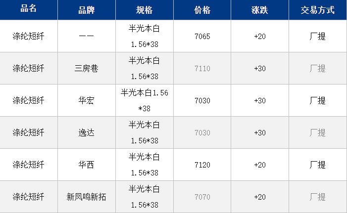 江蘇滌綸短纖現貨價格上漲20元到7065元/噸;原油反彈帶動市場窄幅上漲;日內短纖工廠價格7100-7150元/噸自提,貿易商一口價7060-7100元/噸自提,偏低7020元/噸。