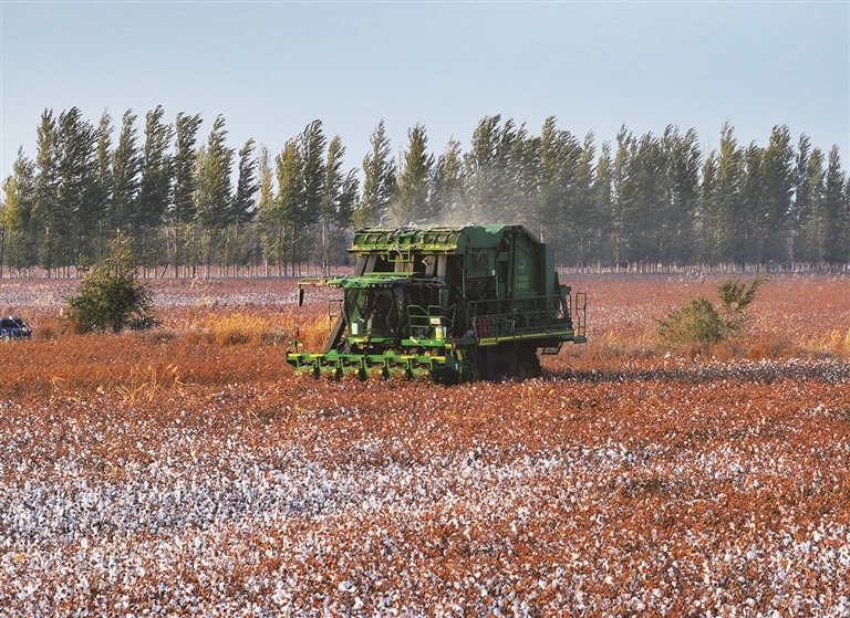11月1日,吉木薩爾縣老臺(tái)鄉(xiāng)老湖村,自走式打包采棉機(jī)正在作業(yè)。目前,老臺(tái)鄉(xiāng)1778畝棉花全部進(jìn)入收獲期,自走式打包采棉機(jī)在棉田里來回穿梭,雪白的棉花被快速采摘、打包,田間地頭一派忙碌的豐收景象。