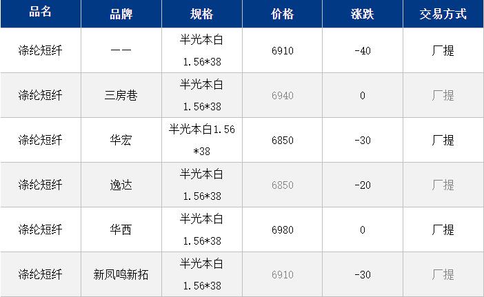 1.4D半光直紡滌綸短纖江浙商談重心6800-7050元/噸出廠或短送,福建7000-7100元/噸附近短送,山東、河北主流6900-7100元/噸送到。