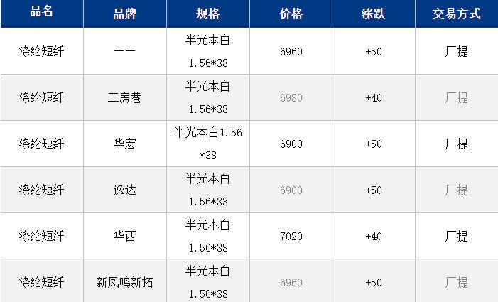 1.4D半光直紡滌綸短纖江浙商談重心6900-7100元/噸出廠或短送,福建7000-7100元/噸附近短送,山東、河北主流7000-7150元/噸送到。